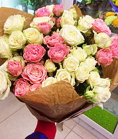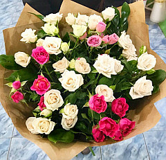 Композиция состоит из кустовых роз белого и розового оттенков. Розовые розы издавна считаются символом искренних чувств, расположенности и надежды на удачное и стремительное развитие отношений. В то же время, белые цветы символизируют чистоту и искренность. Букет уместен не только для подарка любимой девушке, но и как презент близким друзьям.