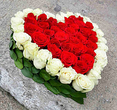 Цветочная композиция выложена в форме сердца, в середине находятся белые розы, обрамленные рядом из красных. Белые цветы издавна считаются отличным способом передать нежность и чистоту, а красные - страстную любовь и желание. Букет прекрасно передает светлую любовь, которую хочет испытать каждая женщина. Возлюбленная обрадуется такому подарку и поймет без слов все, что вы хотите ей сказать. Форма сердца – дополнительный непрозрачный намек, а запах роз поднимает настроение на целый день.